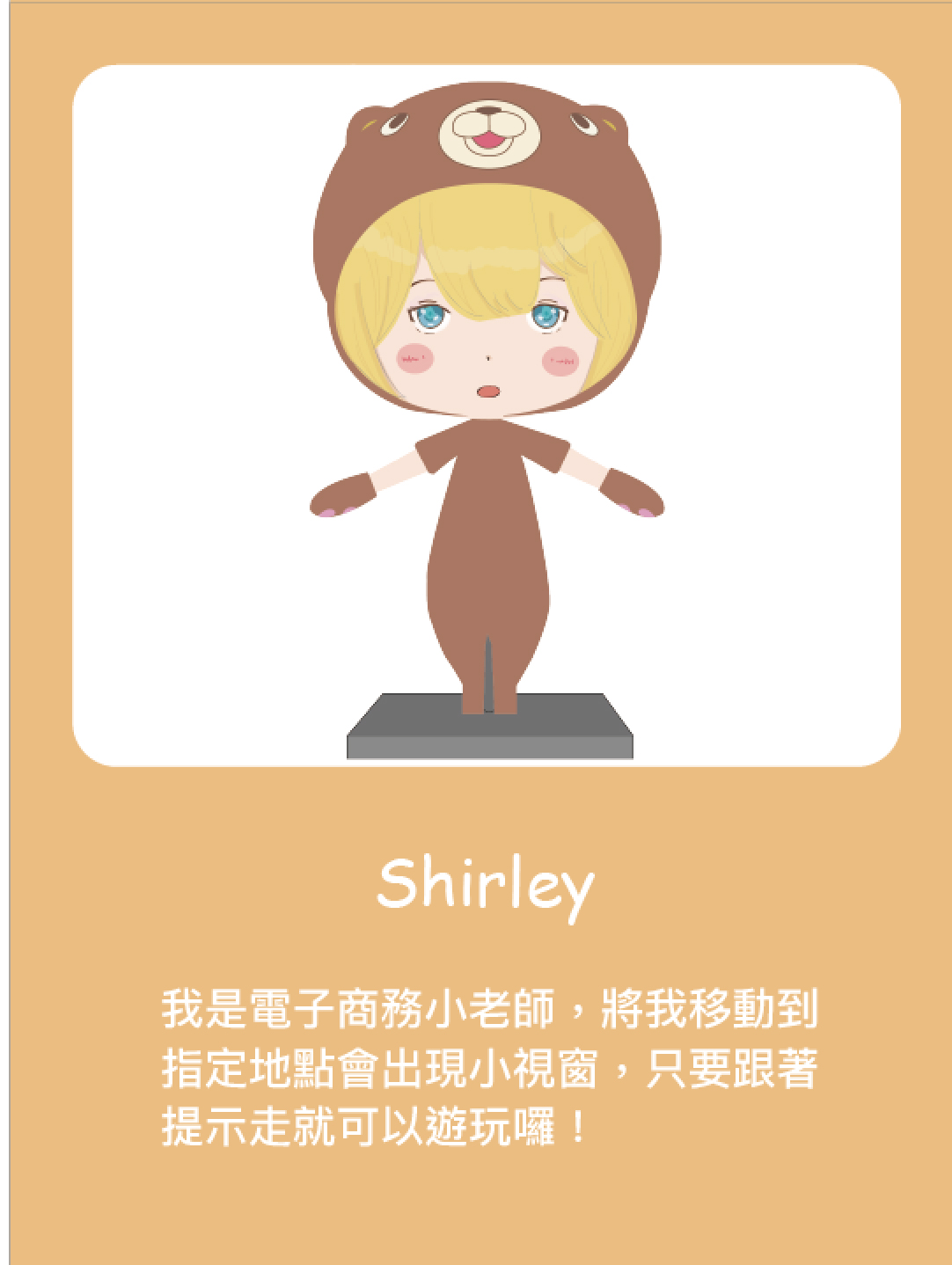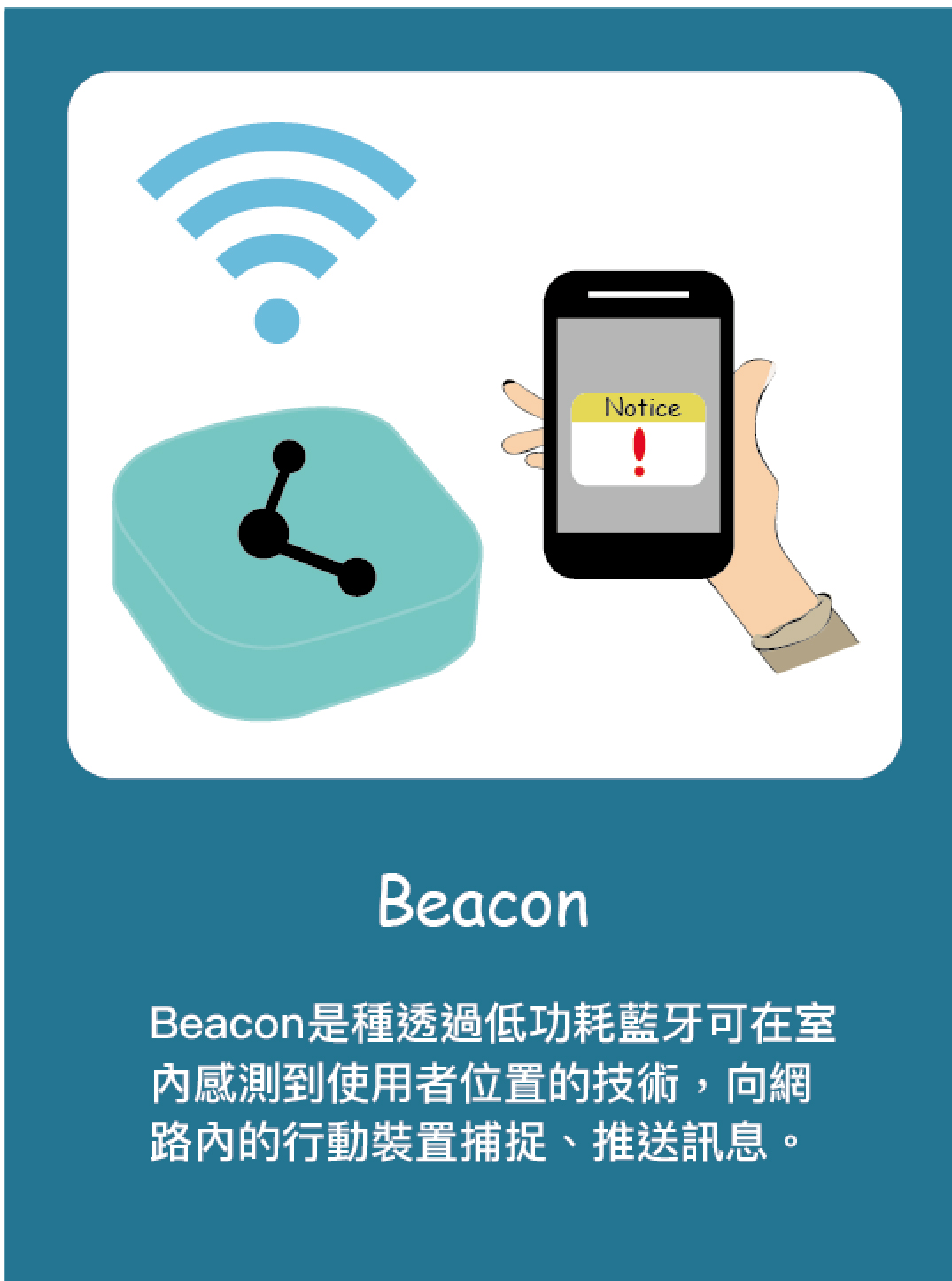 使用AR技術,移動遊戲中的人物進行遊戲學習,其中裡面的故事有Beacon、O2O、群眾募資及區塊鏈,以有趣新奇的方式學習抽象化的概念與新興設備。